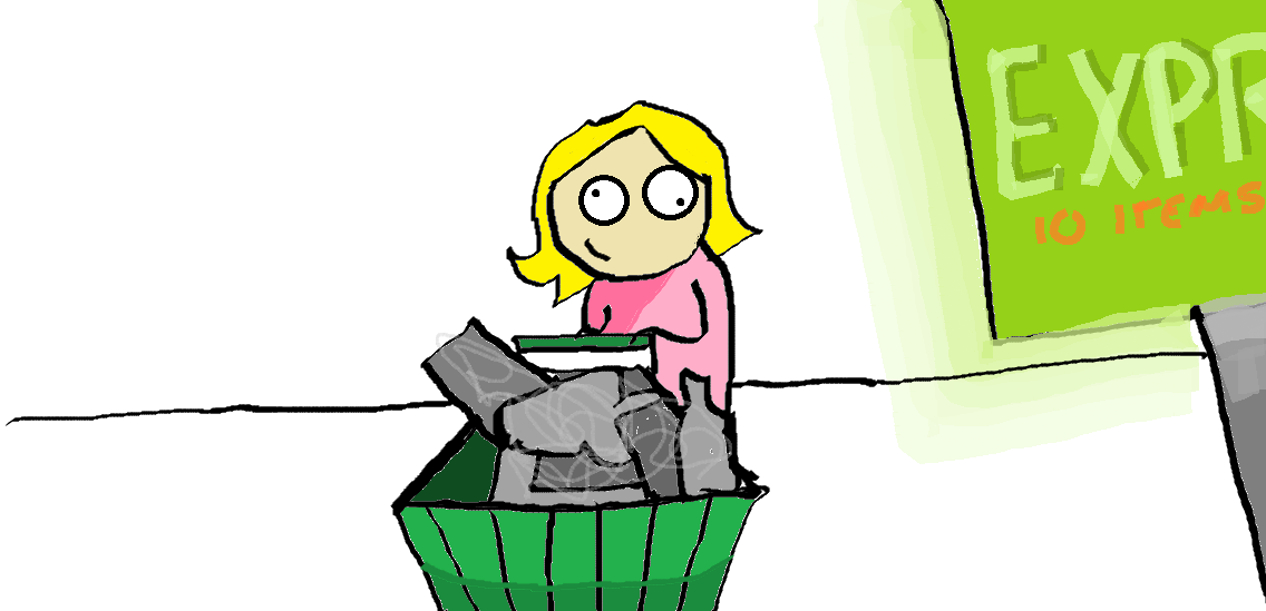 Then you come on through with your cart like, “No big deal, I’m a special circumstance.” And when you’ve finished unloading all of your groceries onto the belt you go.